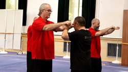 Returning to the powers we’d developed in the partnered 8-power Qigong, we applied that to Taiji Push Hands and finally, as a natural progression, Professor Wu connected all these aspects into martial applications training toward the end of our second week. To achieve this, we had a choreographed dual to work on where Partner ‘A’ performed the Yang Style Bafa Wubu Tao Lü essentially as learned, while Partner “B” fed into it.